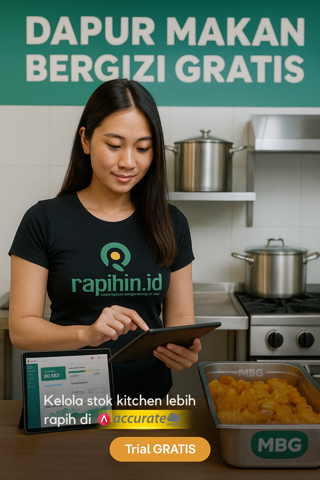 Rapihin.id melayani penjualan resmi Accurate Online untuk mendukung program Dapur MBG Pemerintah Indonesia. Accurate Online kami rekomendasikan sebagai sistem untuk mengelola keuangan di Dapur MBG, karena kami mendukung tata kelola keuangan pemerintahan yang bersih dan transparan untuk mensukseskan program MBG. Anda bisa membeli Accurate Online resmi di Rapihin.id dan dapatkan Training GRATIS 6 JAM khusus untuk pengelola Dapur Makan Bergizi GRATIS, berlaku untuk seluruh Indonesia.